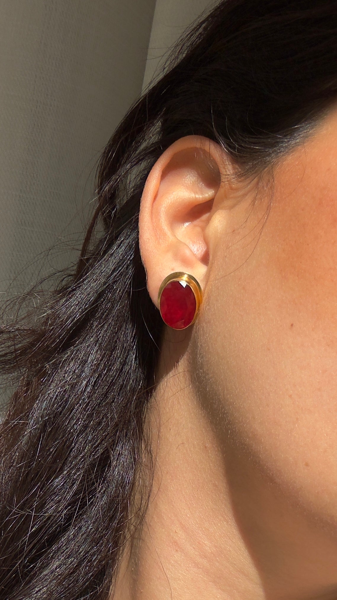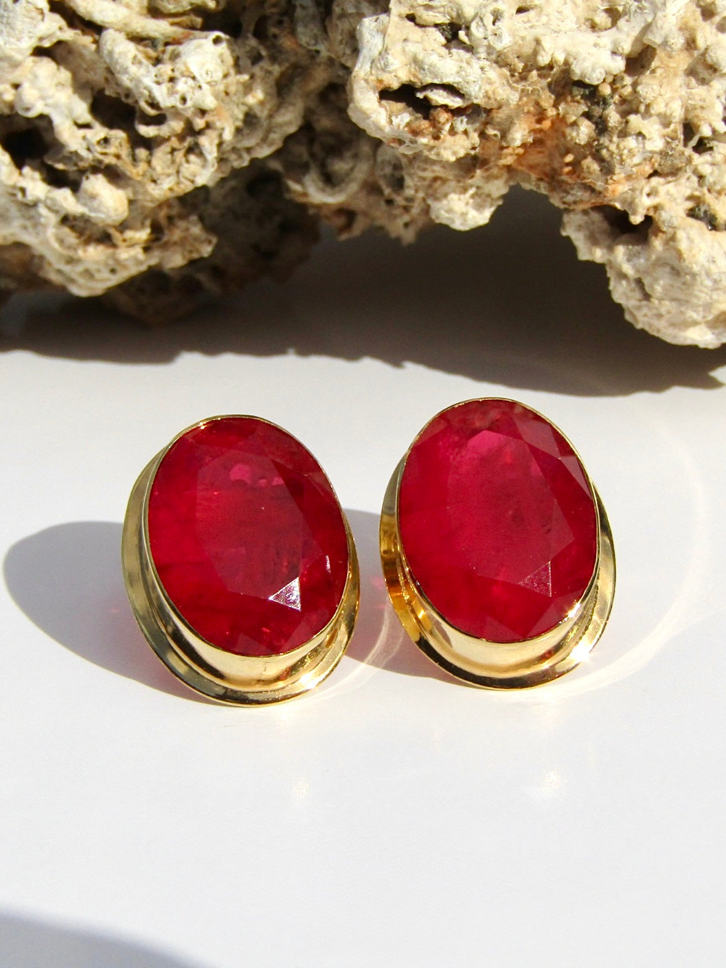 Orecchini su base argento 925 placcato oro 18kt con pietra di laboratorio in ciliegia.