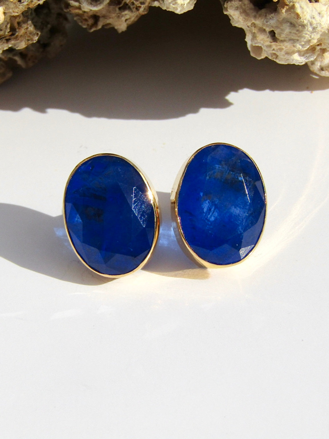 Orecchini su base argento 925 placcato oro 18kt con pietra di laboratorio in colorazione blu.