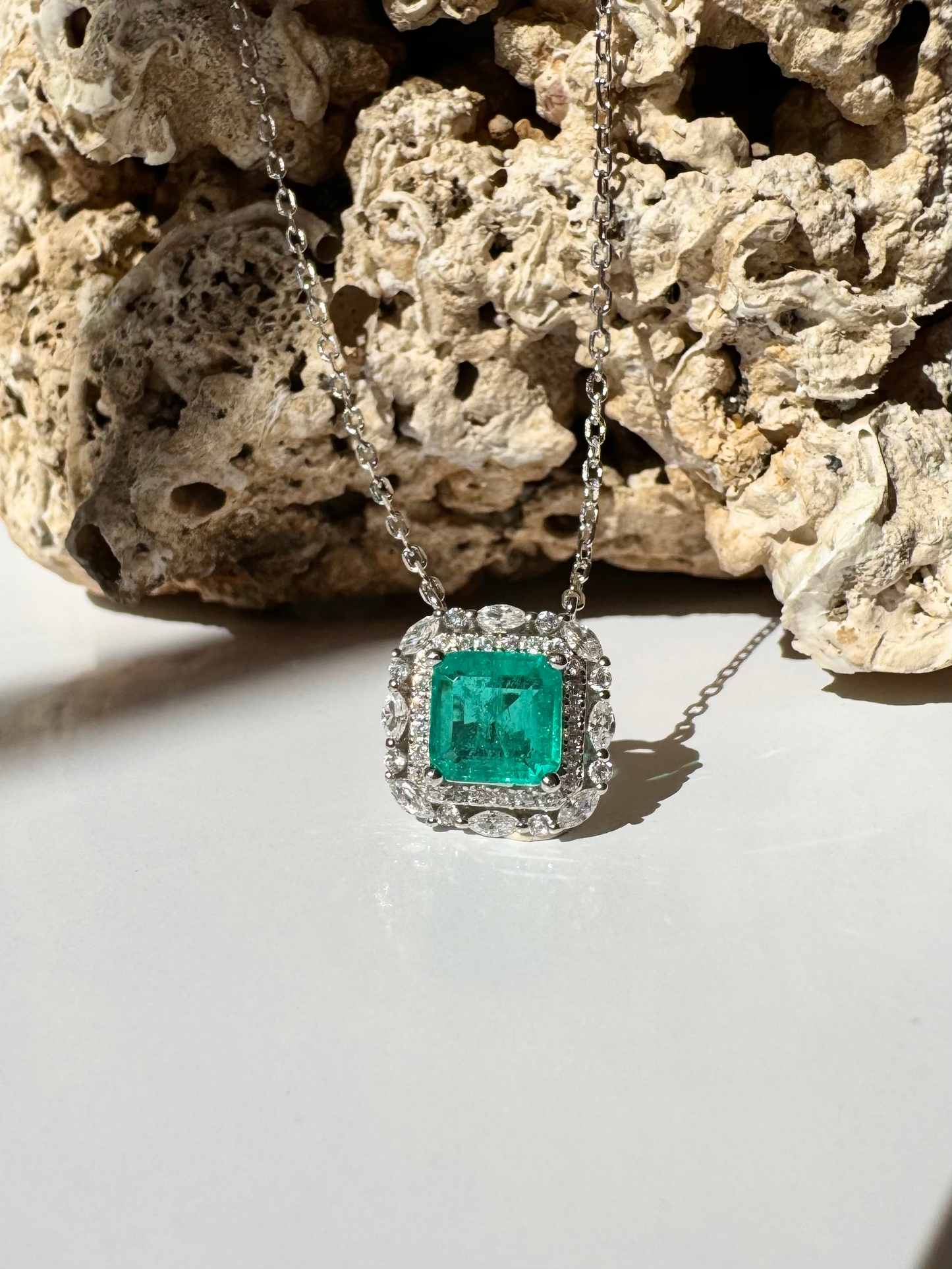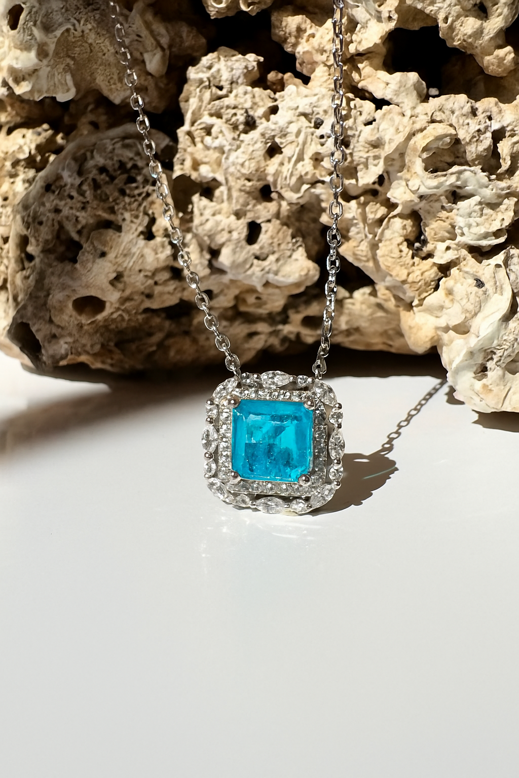 Elegante collana in argento 925 che combina la purezza del quarzo di laboratorio con una doppia fascia di zirconi bianchi dal taglio rotondo e a barca. Il design sofisticato presenta un taglio quadrato come elemento centrale, sapientemente montata su una base in argento sterling che garantisce durabilità e lucentezza nel tempo. Ideale per chi apprezza la qualità artigianale e desidera un accessorio versatile, adatto sia a occasioni speciali che all'uso quotidiano. Un pezzo che riflette eleganza consapevole e attenzione ai dettagli.