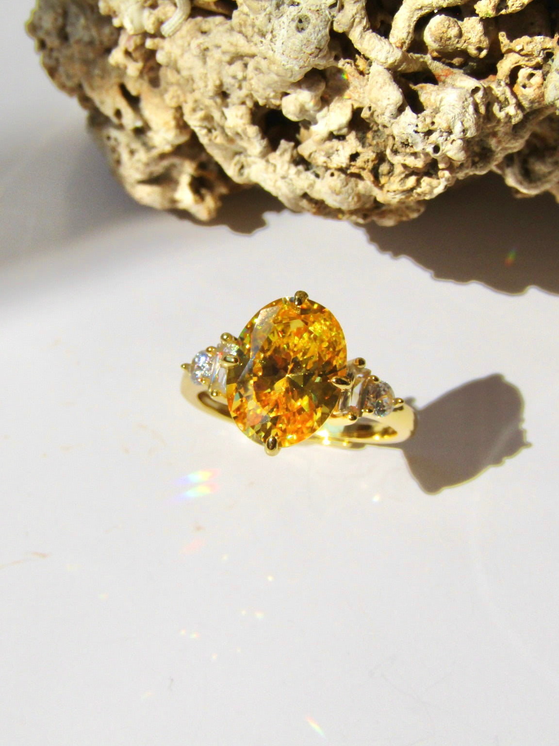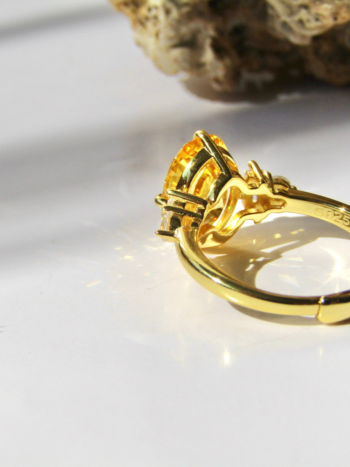 Anello in argento 925 placcato oro 24 kt con quarzo giallo e zirconie ai lati.