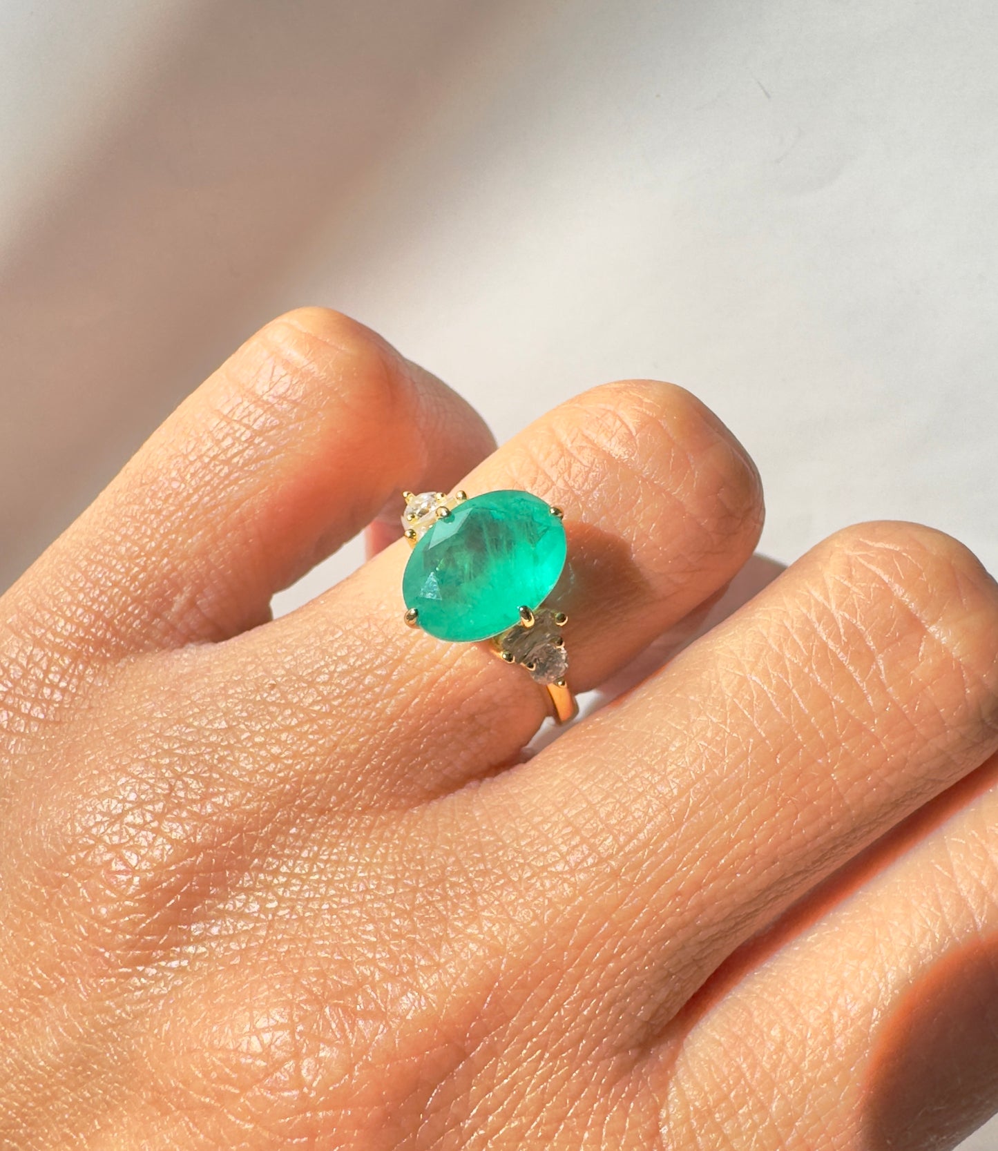 Anello in argento 925 placcato oro 24 kt con quarzo paraiba e zirconie ai lati.