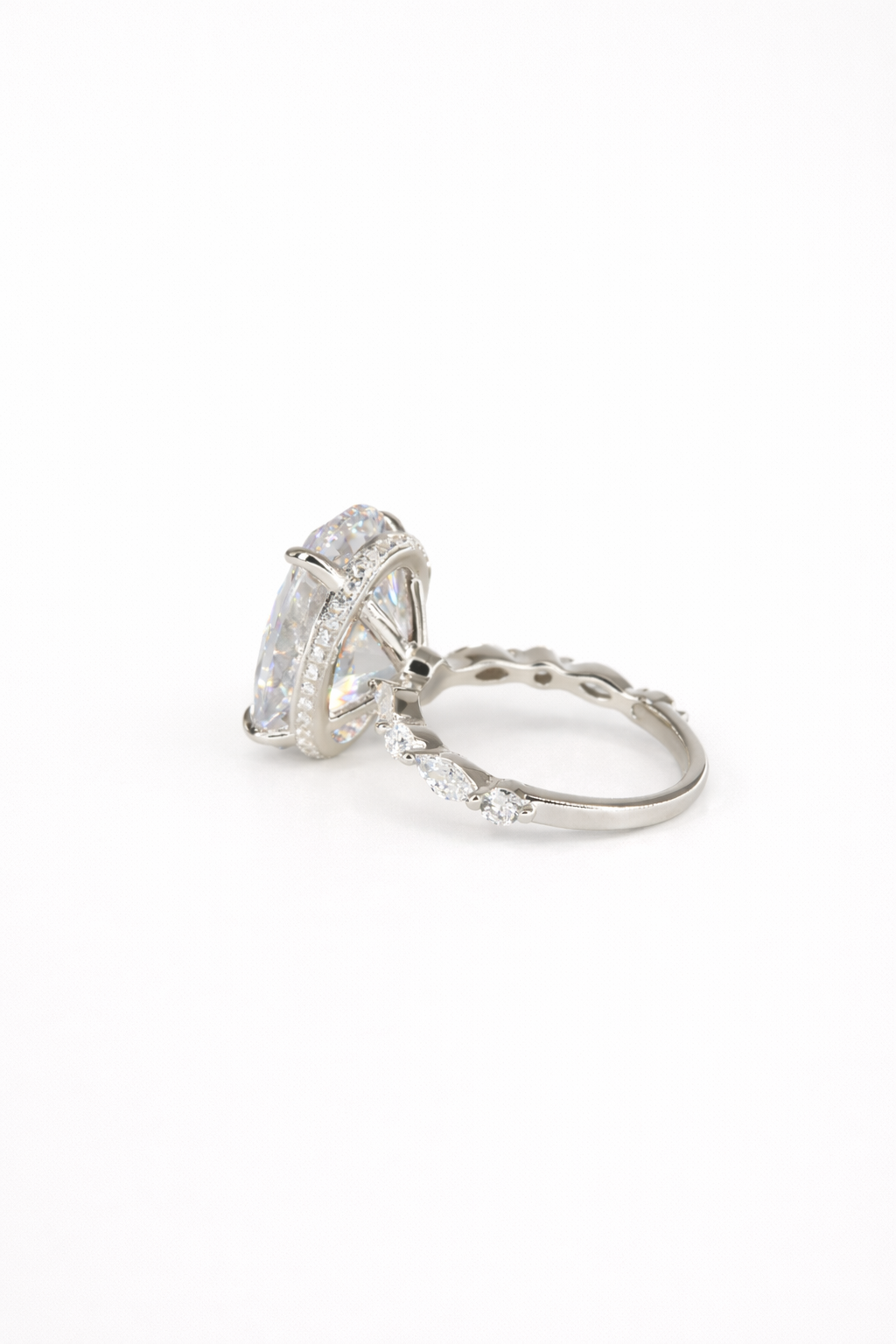 Anello in argento 925 che incarna eleganza contemporanea e raffinatezza. Il pezzo è caratterizzato da una splendida pietra di quarzo di laboratorio con taglio ovale al centro, che cattura la luce con brillantezza cristallina. Il gambo, finemente tempestato da quarzi di laboratorio in taglio rotondo, crea un effetto luminoso che si estende lungo tutta la circonferenza, conferendo al gioiello una presenza sofisticata e armoniosa. La qualità dell'argento 925 garantisce durabilità e un finish impeccabile. Un accessorio versatile che si distingue per il suo design elegante, perfetto per chi apprezza i dettagli raffinati e desidera un gioiello che combini bellezza e qualità artigianale.