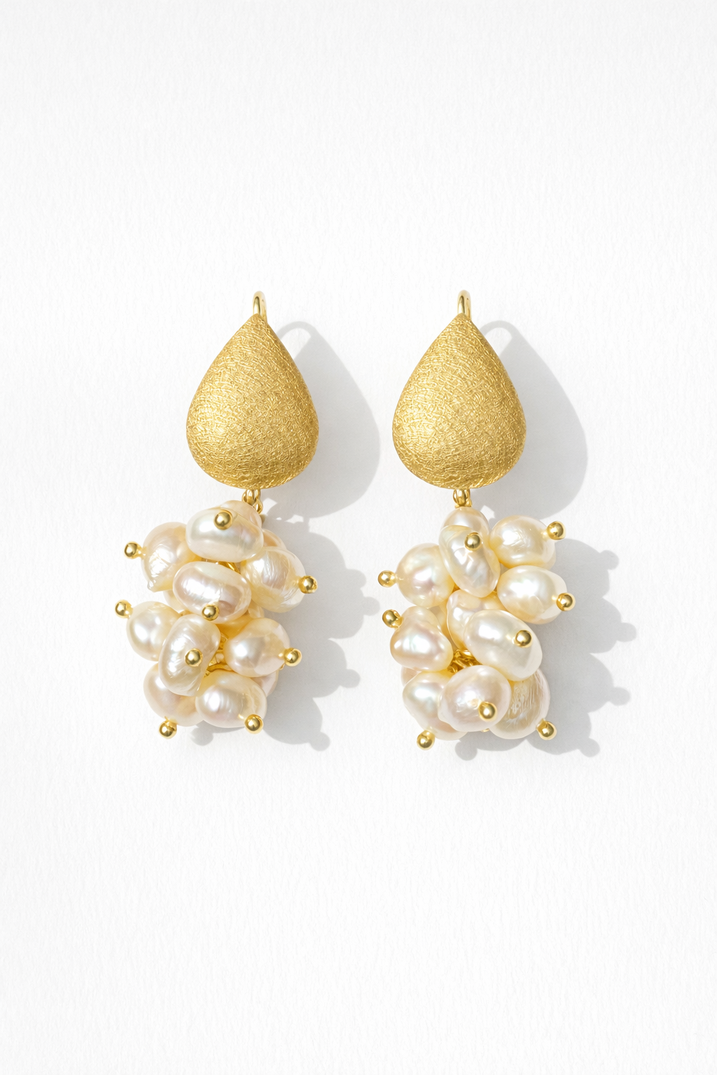 Orecchini eleganti realizzati in argento 925 placcato oro 18kt, impreziositi da delicate perle di coltivazione disposte a grappolo. Il design sofisticato combina la luminosità dell'oro con la purezza dell'argento, creando un effetto raffinato e versatile. Le perle naturali conferiscono un tocco di lusso discreto, perfetto per occasioni speciali o per elevare lo stile quotidiano. Un accessorio senza tempo che valorizza il viso con eleganza e classe.