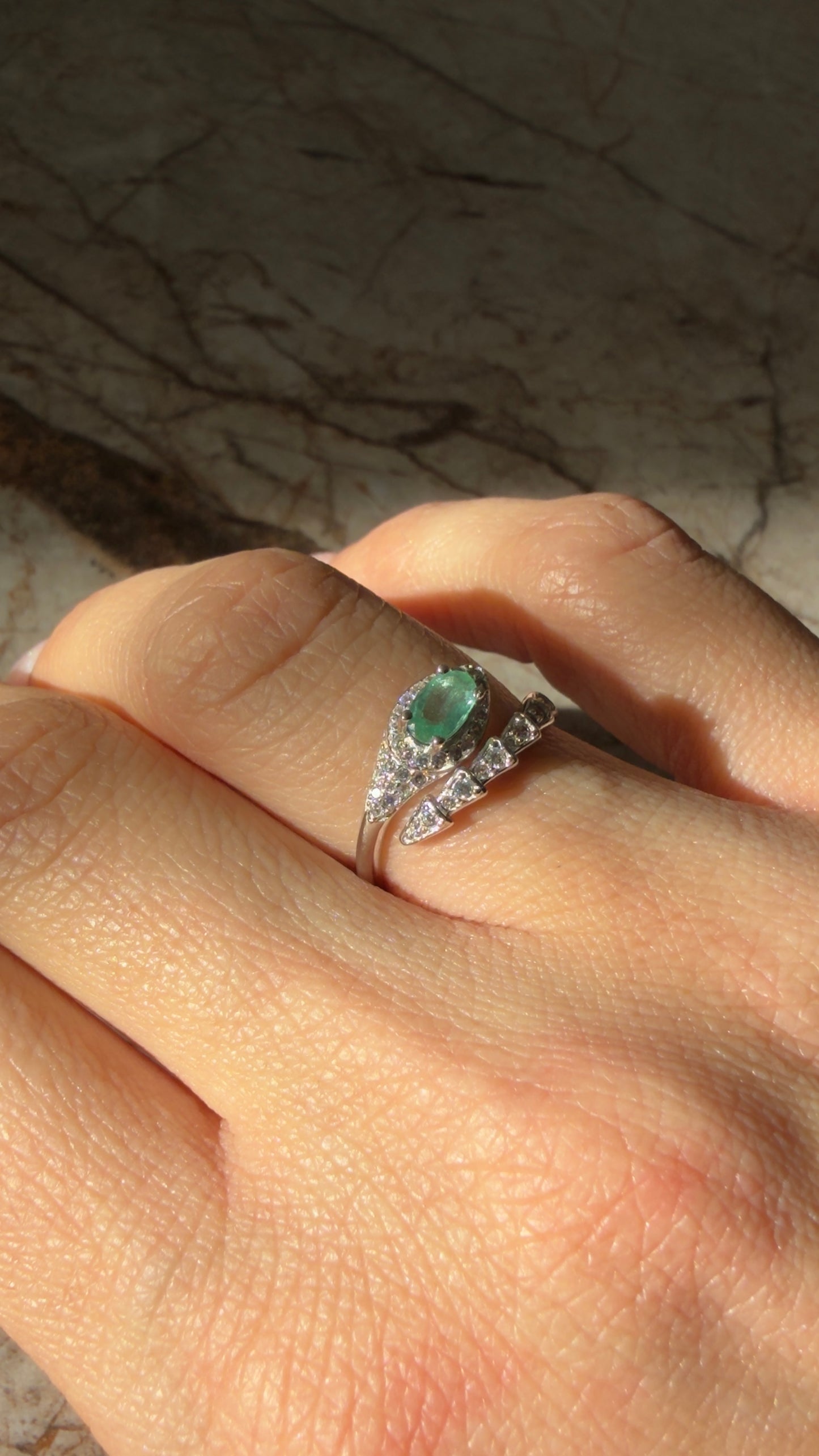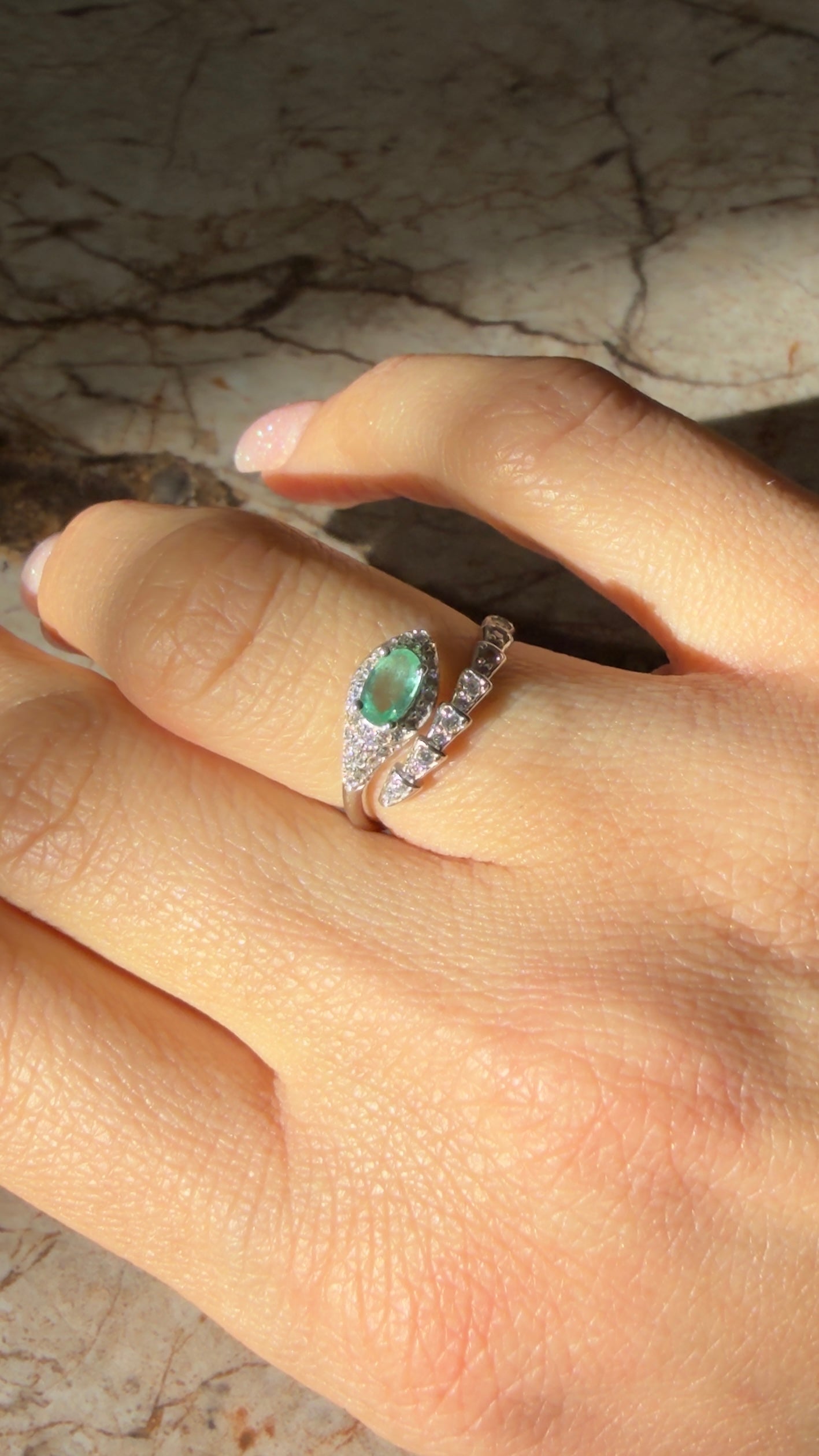 Anello affascinante che unisce eleganza e simbolismo. Realizzato in argento 925 di alta qualità, presenta un design a forma di serpente che avvolge delicatamente lo smeraldo taglio ovale, pietra preziosa apprezzata per la sua bellezza e rarità. Le zirconie che contornano la gemma principale amplificano lo splendore dell'anello, creando un gioco di luci raffinato. Perfetto per chi ricerca un gioiello sofisticato con carattere distintivo, ideale sia per occasioni speciali che per un uso quotidiano consapevole.