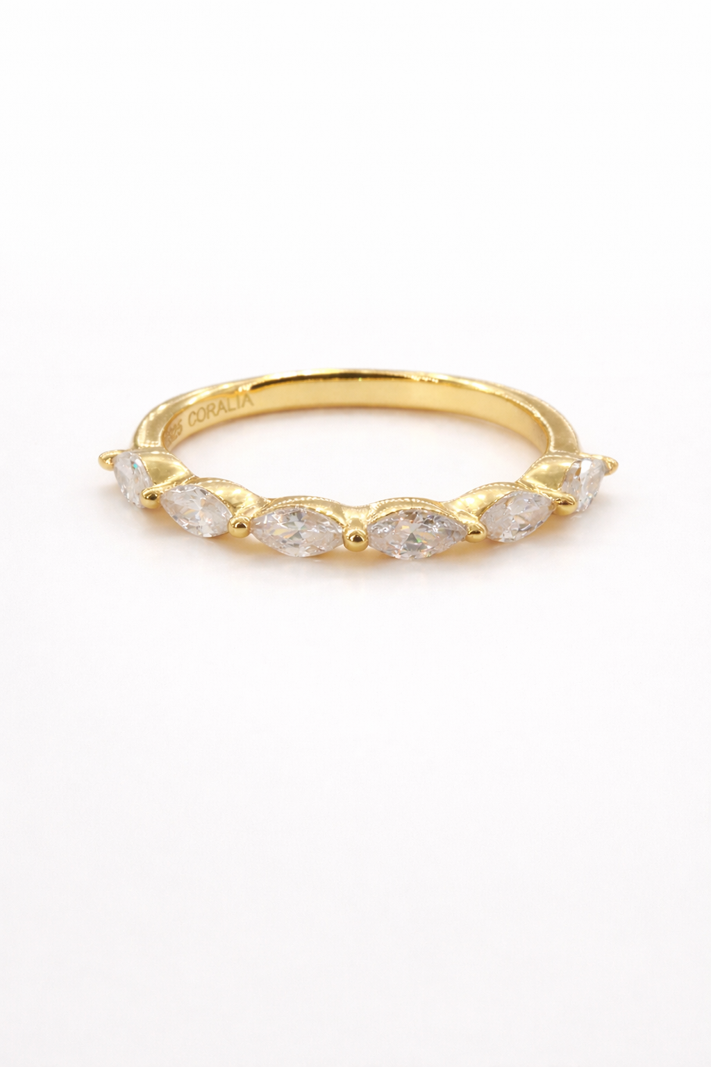 An elegant ring crafted from 18kt gold-plated 925 silver, embellished with a stunning marquise-cut white lab stone. The sophisticated design enhances the gem's brilliance, creating a luminous and refined effect. The combination of noble metals lends a luxurious and versatile look, perfect for special occasions or a touch of everyday elegance. A conscious choice that combines aesthetic beauty and sustainability, maintaining the artisanal excellence of the Lumina collection.