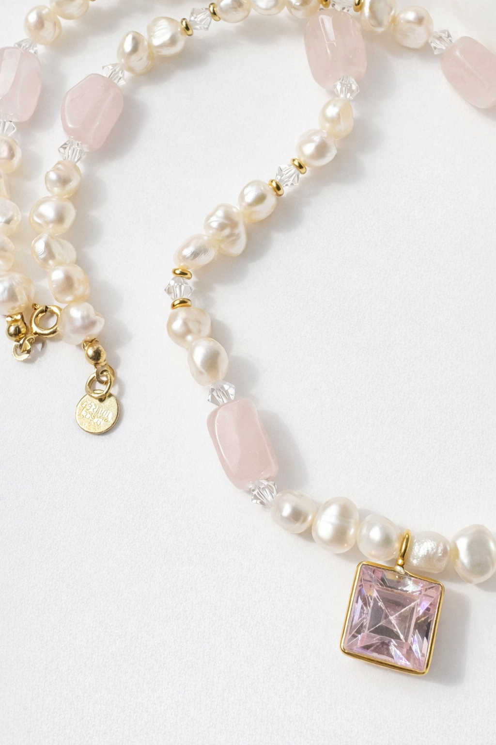 Necklace in freshwater cultured pearls with rose quartz and inserted in gold-plated 925 silver.