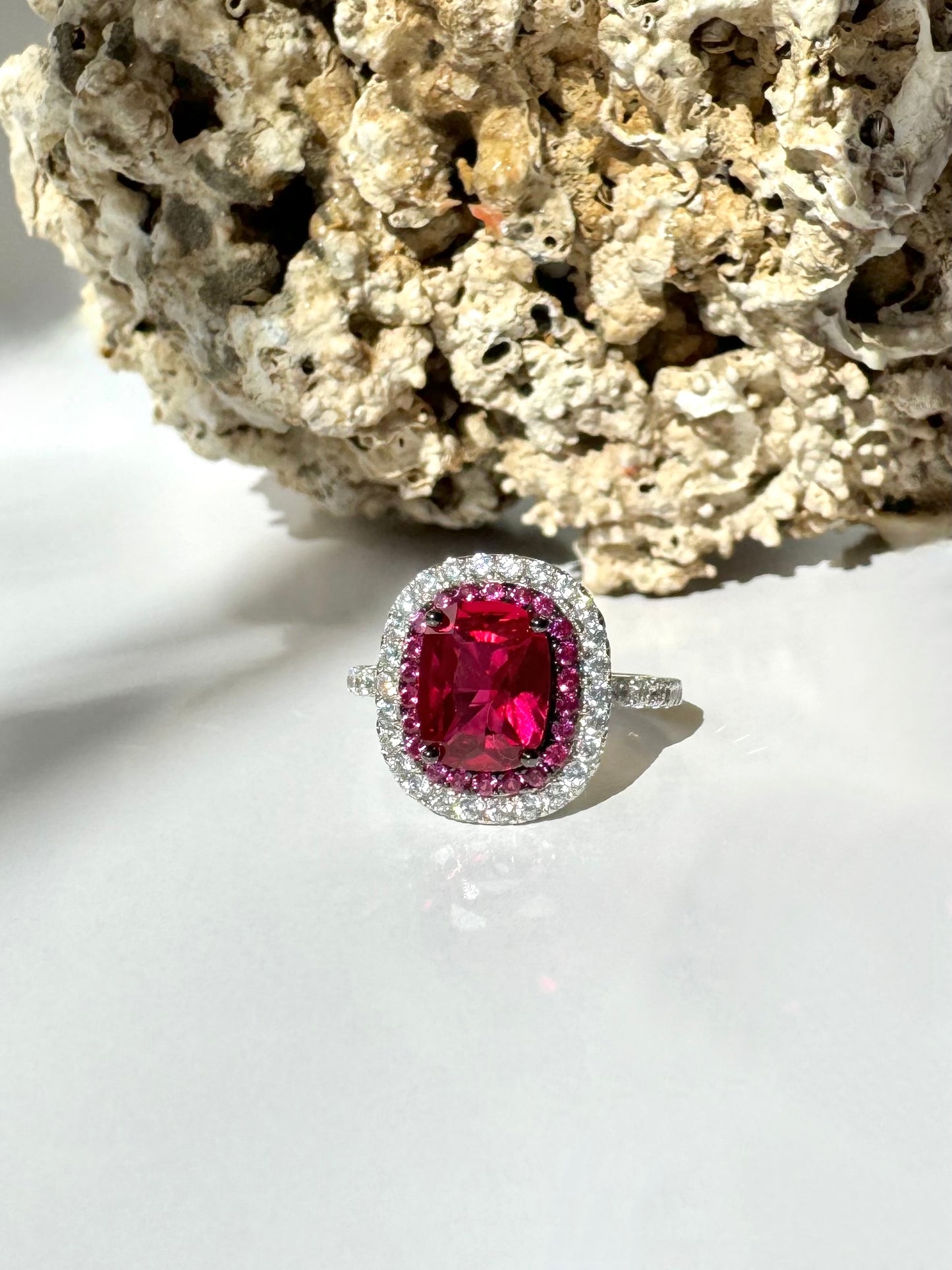 Anello in argento 925 con quarzo di laboratorio con doppia fascia zirconie